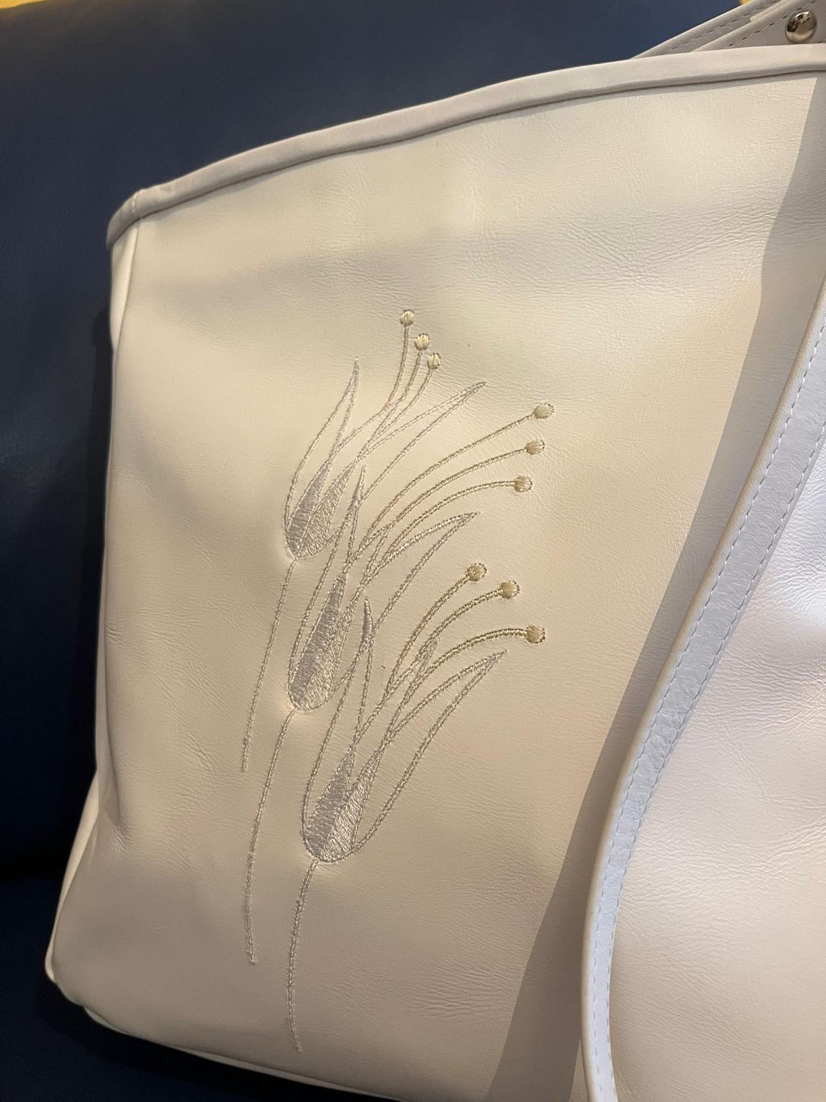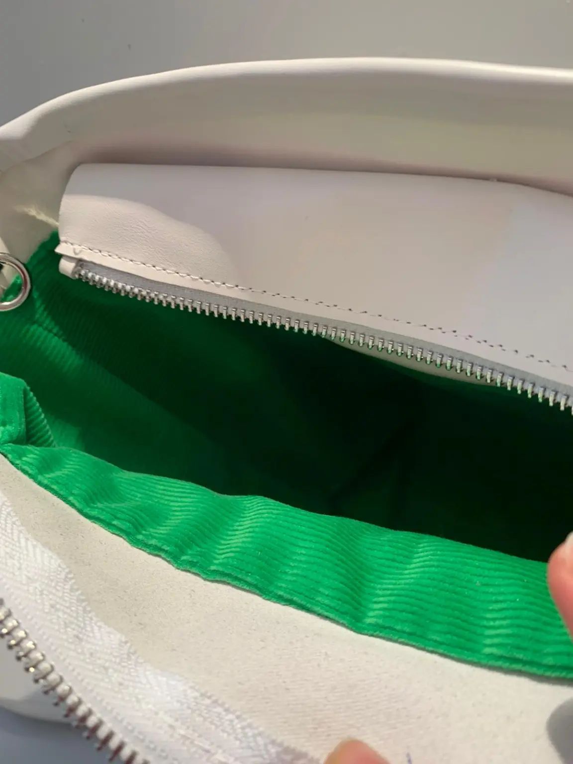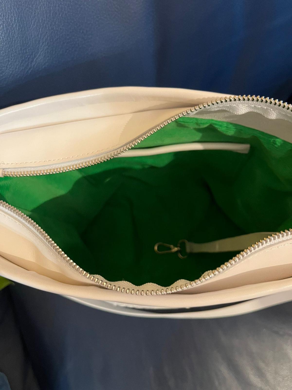 Arricchita da un ricamo floreale tono su tono con all’interno una fodera in velluto verde acceso.